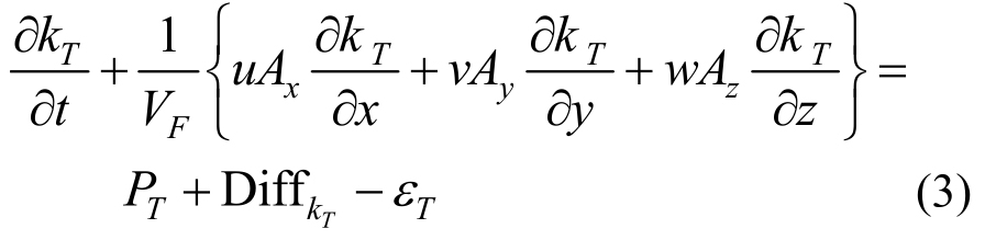 本文所建立的三维数值波浪水池要模拟波浪与建筑物的相互作用,波浪会出现剧烈的变形破碎,因此采用RNGk-ε模型作为湍流模型效果较好。湍动能kT和其耗散率εT的方程表达式如下: