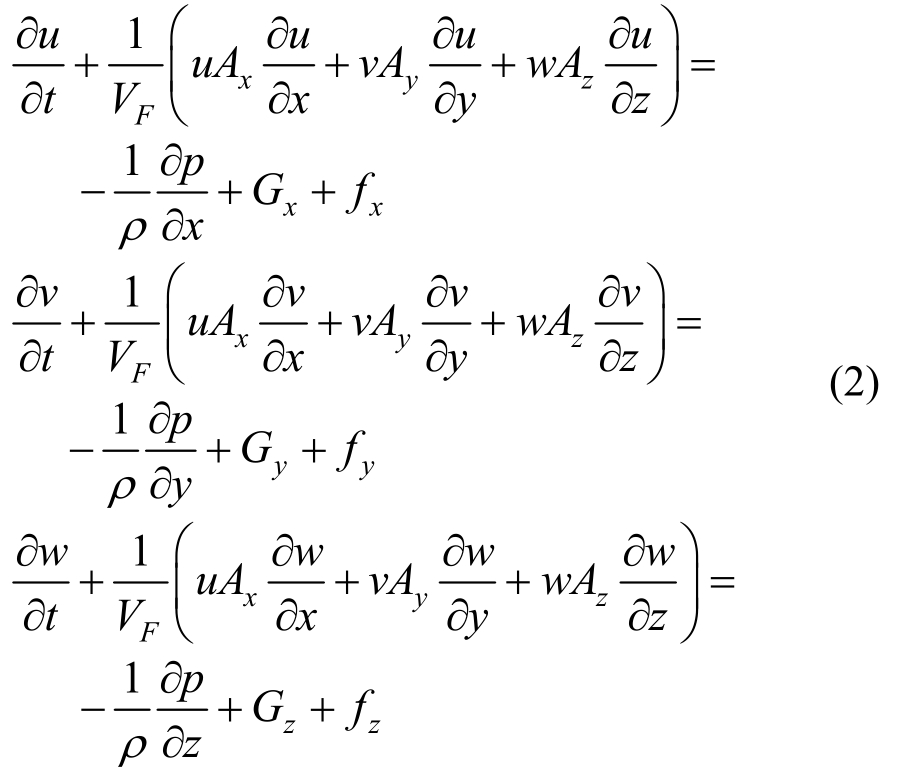 式中:ρ为流体密度;p为压力;u、v、w为对应x,y,z方向的速度分量;Ax、Ay、Az和VF分别为与FLOW-3D中FAVOR网格技术相关的x、y、z方向可流动的面积分数和可流动的体积分数;Gx、Gy、Gz为物体在x、y、z三个方向的重力加速度;fx、fy、fz为x、y、z方向的黏滞力加速度。