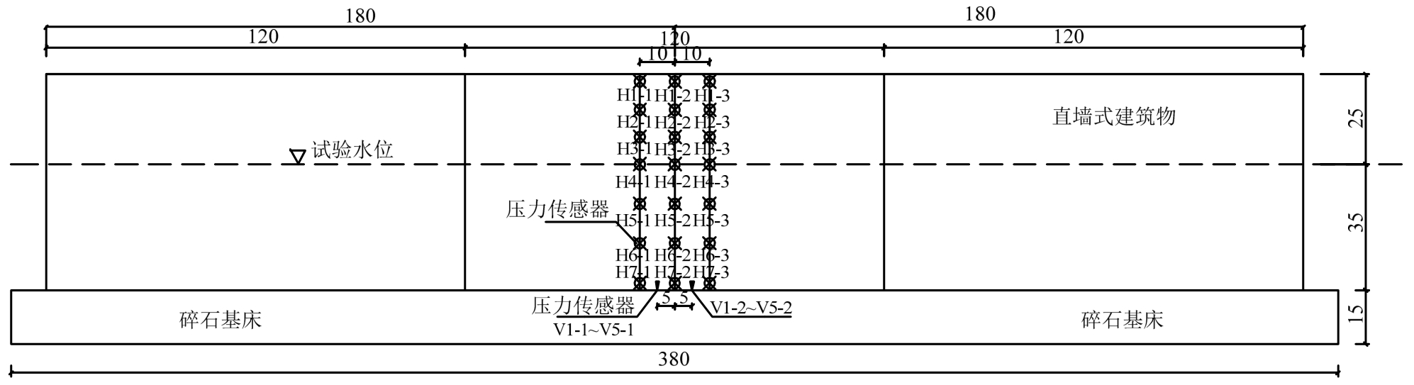 图1 波压力传感器在防波堤立面上的布置 /cm
