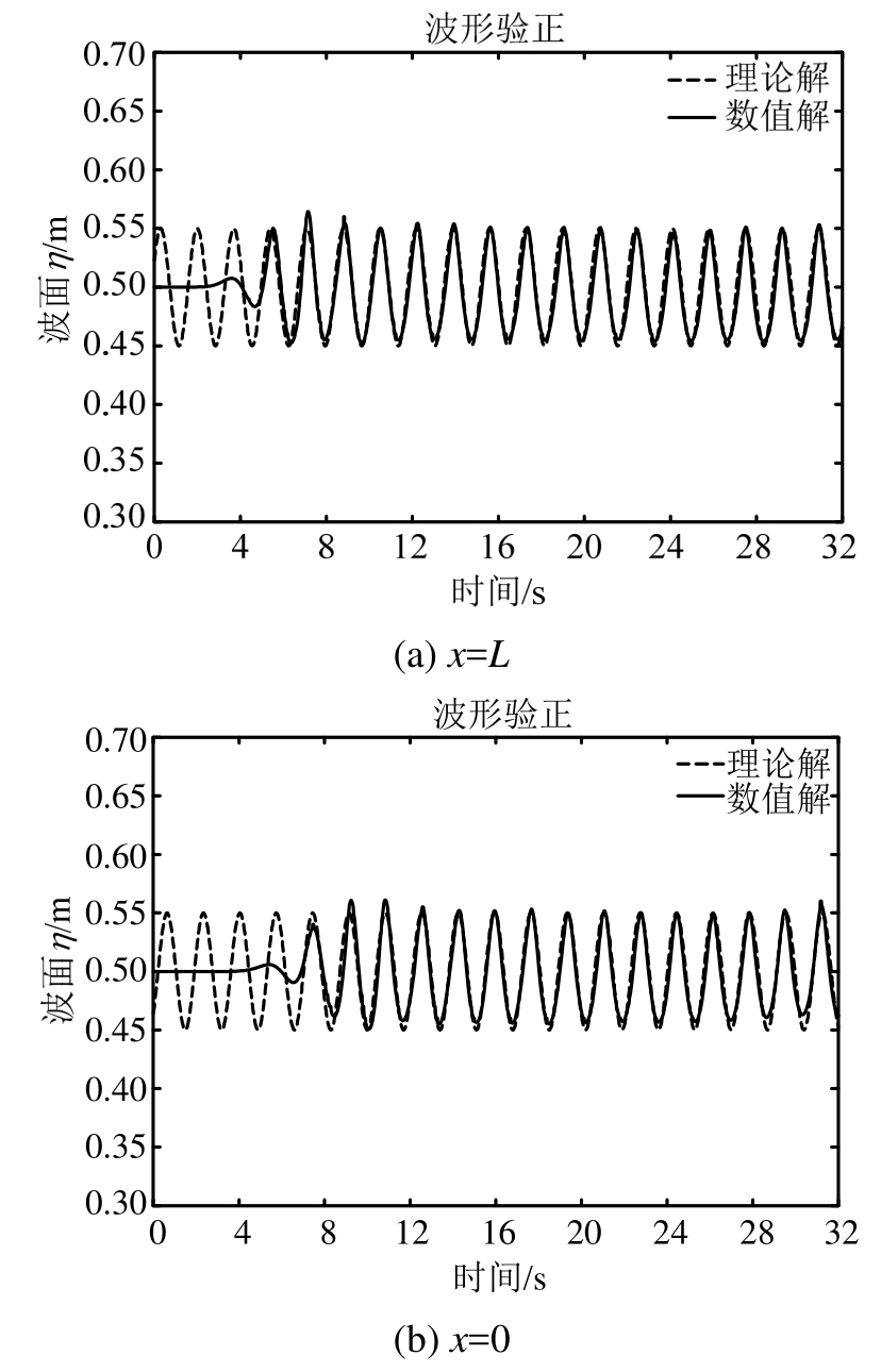 图9分别给出了无直立堤时距直立堤前一倍波长(x=L)和直立堤前(x=0)两个位置处的波面历时曲线。由图可见,与理论波面曲线比较,数值水池可以生成稳定的波浪,数值解与理论解吻合较好。