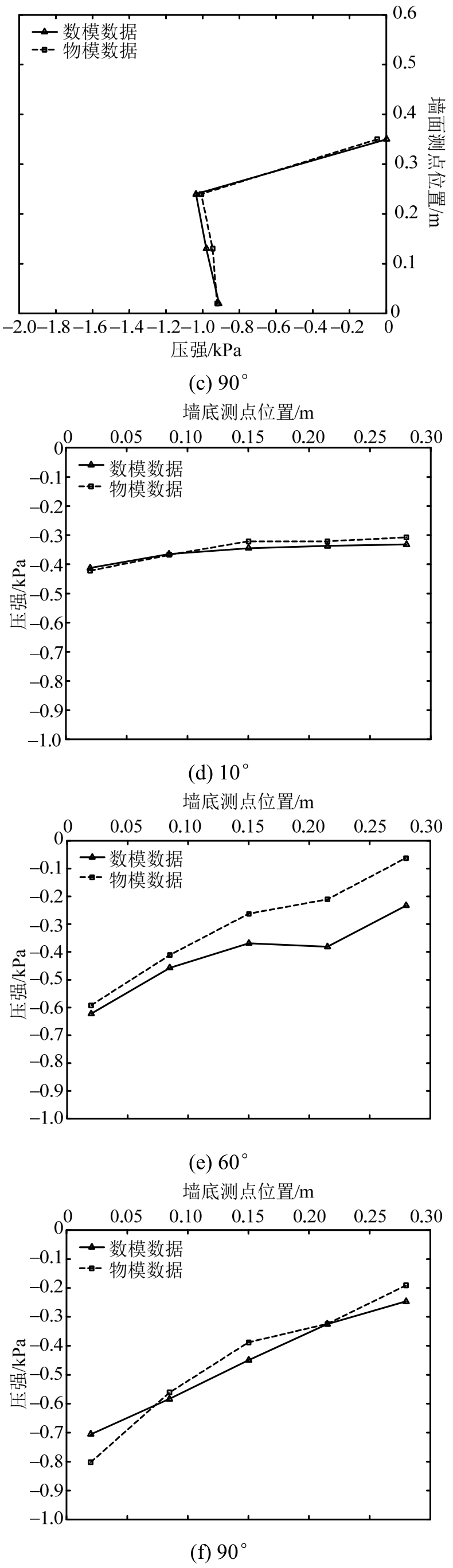 由于篇幅所限,本文仅给出入射角为10°、60°及90°时试验和数值的波压力及波吸力分布图。如图15和图16所示,波压力及波吸力分布的试验与数值结果吻合较好。同时为了便于读者阅读,给出了10°工况时墙面及墙底的波压力分布示意图,如图17所示。