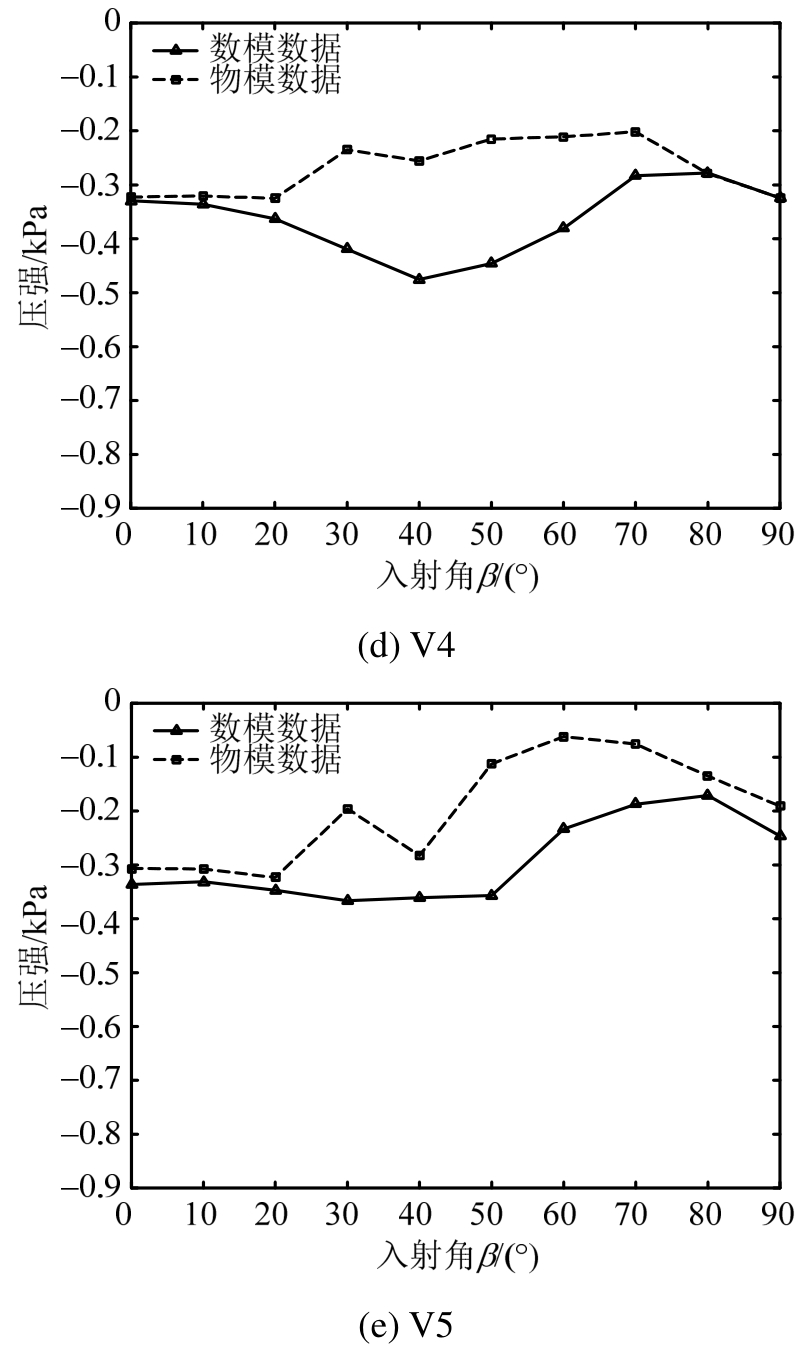 (2)在总体趋势上,墙面各测点波吸力随入射角的增大而增大。墙底测点波吸力变化的数值和试验结果吻合程度稍差,V1、V2测点处的波吸力总体上随入射角的增大而增大,90°时有最大值;V3、V4测点试验结果的趋势是先减小后增大,数值结果呈先增大后减小再增大的趋势,V5测点试验及数值结果在总趋势上呈“勺子”形;试验和数值吻合稍差可能是由于波浪绕射或试验与数值在基床组成上的差别导致的。