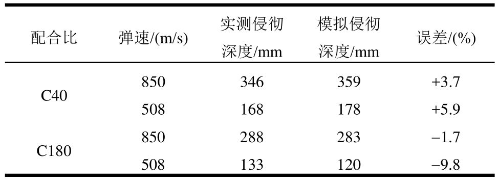 通过对C40和C180靶体受高速与低速弹体侵彻四种不同工况的模拟,其结果与真实试验结果的比较如表6所示。从表6可以看出,利用LS-DYNA软件对弹体侵彻的模拟与真实试验情况很逼近,可以达到较高的精度,对于弹体的侵彻深度,模拟值与真实值的最大误为-9.8%,最小误差为-1.7%。因此可以得出,所采用的HJC模型参数能很好地模拟弹体对超高性能混凝土的侵彻过程。