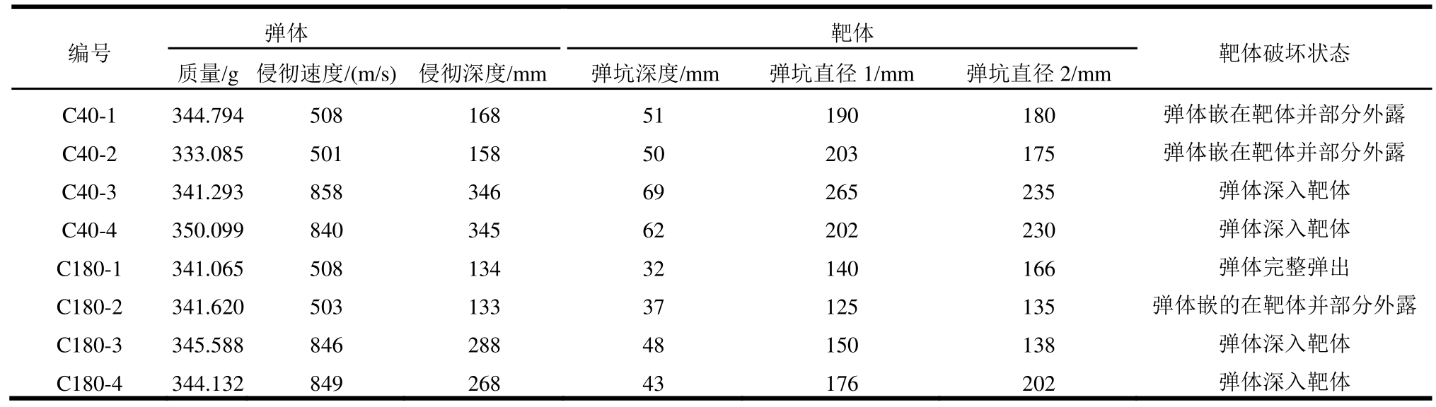 试验首先将靶体吊装就位,靶体着弹面中心对准炮口中心,确保靶体着弹面与水平面垂直,以保证弹体在靶心处垂直侵入靶体。利用高速摄影机拍摄弹体在高速飞行下的动作,观察着靶姿态。仪器准备就绪,炮房封闭,人员清场,开始侵彻试验。侵彻完成后,记录弹体飞行速度,测量靶体上的侵彻深度、弹坑直径、裂缝数量、裂缝长度、裂缝宽度等数据。