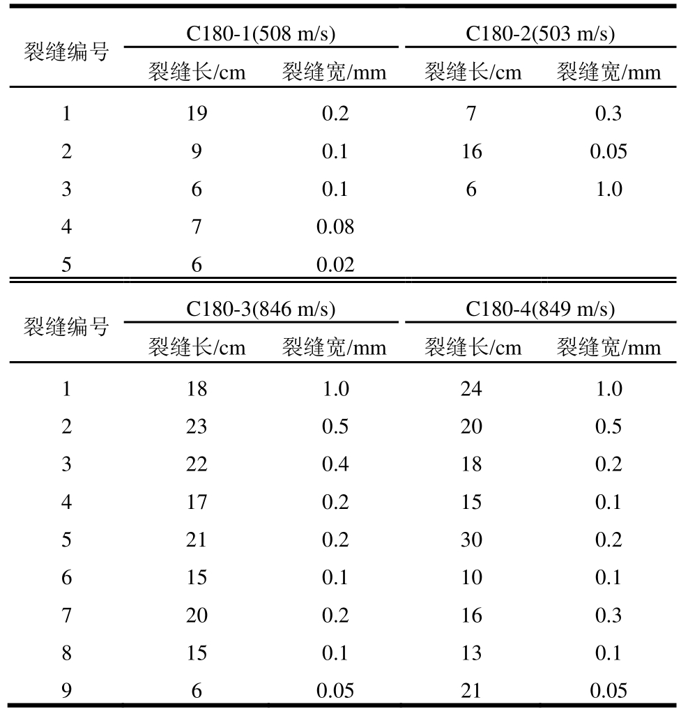 各靶体受弹体侵彻后的状况如图 4和图 5所示,各靶体中裂纹数量及宽度归纳于表3和表4中。从以上图和表中数据可以看出,弹体侵彻速度对裂纹数量及宽度影响明显,速度越大,靶体上裂纹数量越多、宽度越宽。对于C40靶体,850 m/s弹体侵彻后裂纹数量多达 9条,其中最大宽度可达2.0 mm,靶体呈现出最为严重的破坏;对于C180UHPC靶体,在相同条件下的破坏程度降低,其裂纹数量减少为9条,最大宽度约为1 mm,靶体整体性保持完好。从中可以看出,C180靶体具备优越的抗冲击能力。