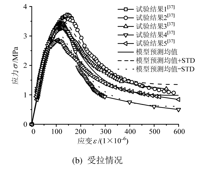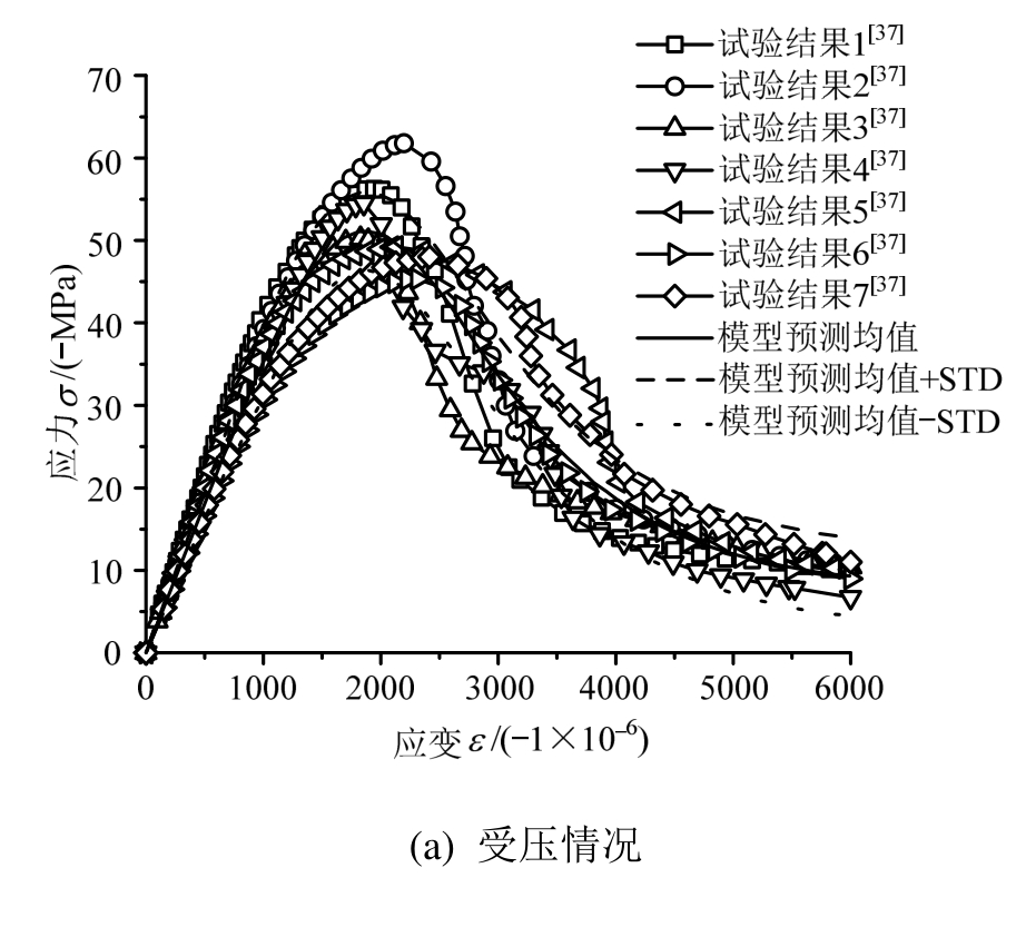 通过所提出的本构模型得到了单调荷载作用下混凝土随机力学行为的预测结果(图5)[64],并将之与试验结果进行对比。对比结果表明:主要试验点落在应力均值加、减一倍标准差的范围之内。这正是随机损伤本构模型的优势所在[65]:不仅可以在均值意义上反映混凝土应力-应变关系,也可以在概率意义上预测其离散范围,从而更为全面地反映了混凝土材料力学行为的非线性与随机性。
