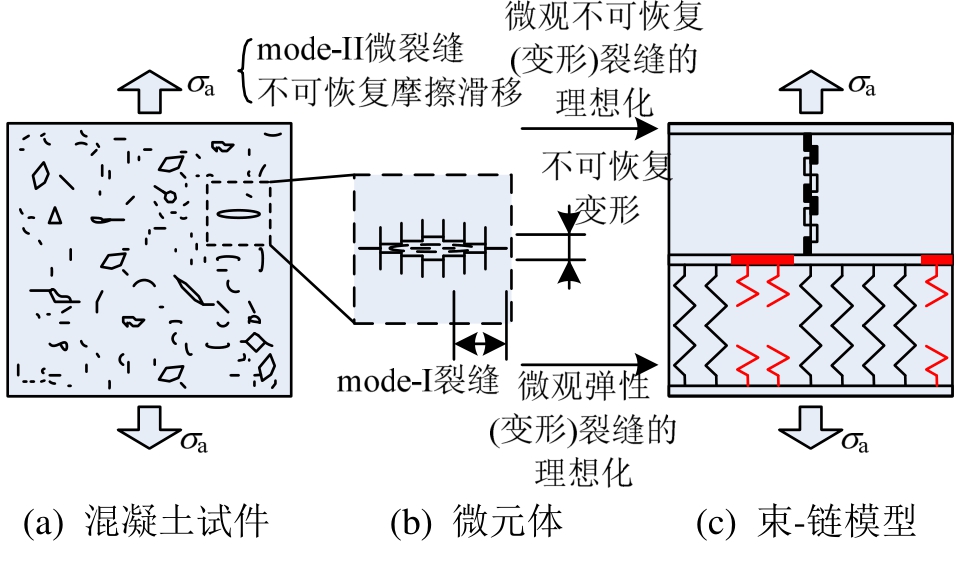 基于上述微观损伤机理分析,为了表征混凝土中由随机不可恢复变形裂缝所导致的不可恢复应变产生发展,把不可恢复(应变)链模型引入到均匀荷载分布方式下的纤维束模型中[46―49,54―55],从而得到混凝土束-链模型(Fiber bundle-irreversible chain model, BCM)[63―64](图2)。并且,束-链模型的统计物理意义主要表现为,不断发展的纤维断裂,即弹性损伤,导致了有效受力面积的不断减小与宏观弹性模量的不断劣化,从而导致了有效应力的不断增大;而有效应力驱使不可恢复单元剪切断裂,即不可恢复损伤的不断发展,并导致了宏观不可恢复应变的发展(图2)。