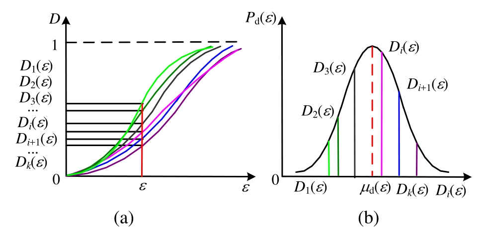 考虑到束-链模型母体中所有个体的随机损伤特性,即细观个体的随机性,于是,可得到母体的损伤变量 D(ε)与不可恢复损伤变量 Di(ε)的随机场特征(图4)[63―64]。
