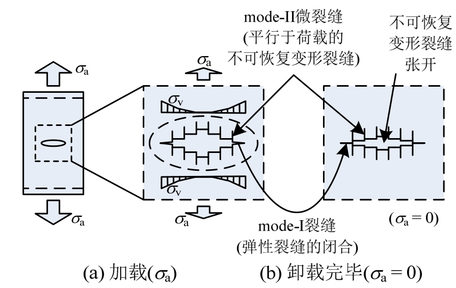 考察微缺陷附近的区域,卸载后,由局部剪应力导致的mode-II微裂缝发展,促使材料中产生微观变形(见图1中的微观变形 b)与对应的不可恢复应变。于是,mode-II微裂缝导致了一部分的不可恢复应变发展[61―63]。