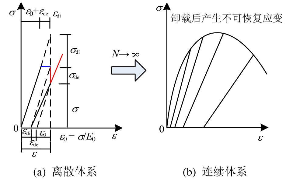 通过不可恢复链模型来模拟有效应力驱动的不可恢复应变行为,于是,定义束-链模型个体在总应变空间下的弹性损伤变量,不可恢复(变形)损伤变量与(总)损伤变量[63―64],并且得到了考虑弹性损伤与不可恢复损伤耦合的束-链模型个体的损伤变量演化方程[63―64]。该损伤变量演化方程中的损伤变量 D(ε)与文献中的纯弹性损伤变量 DE(ε)[36,38,54]是不一样的,因为其合理地考虑了弹性损伤与不可恢复损伤之间的耦合作用(图3)[63―64]。