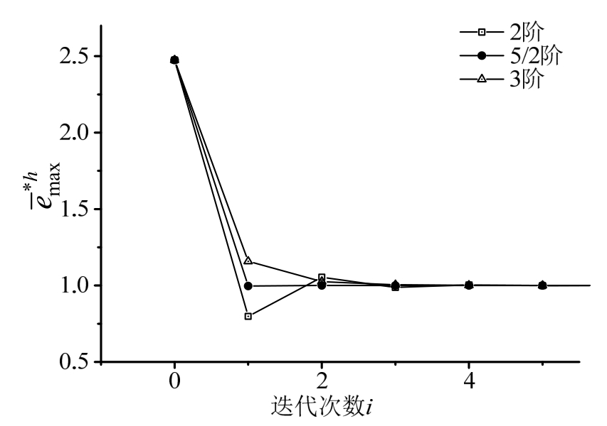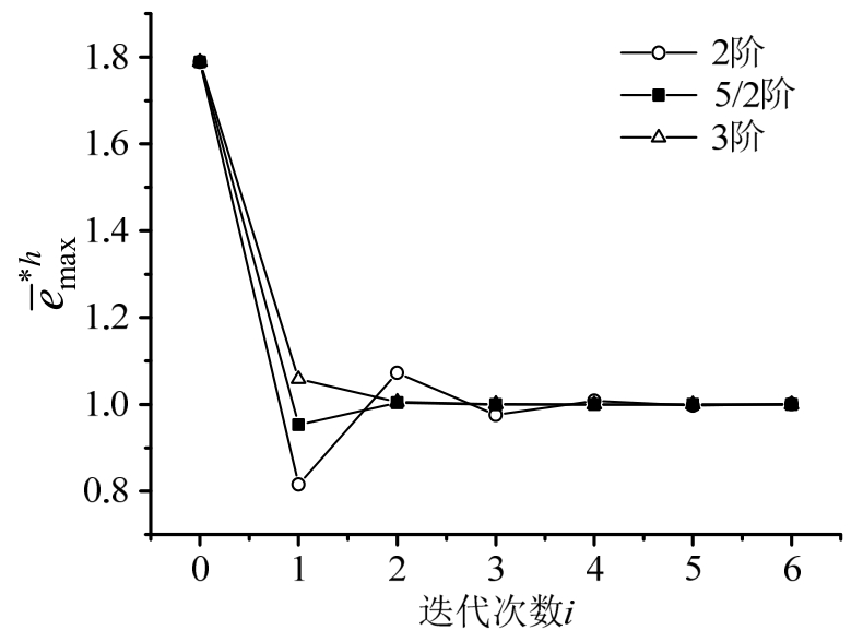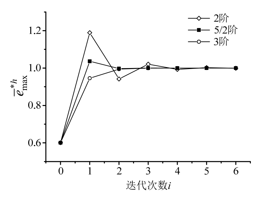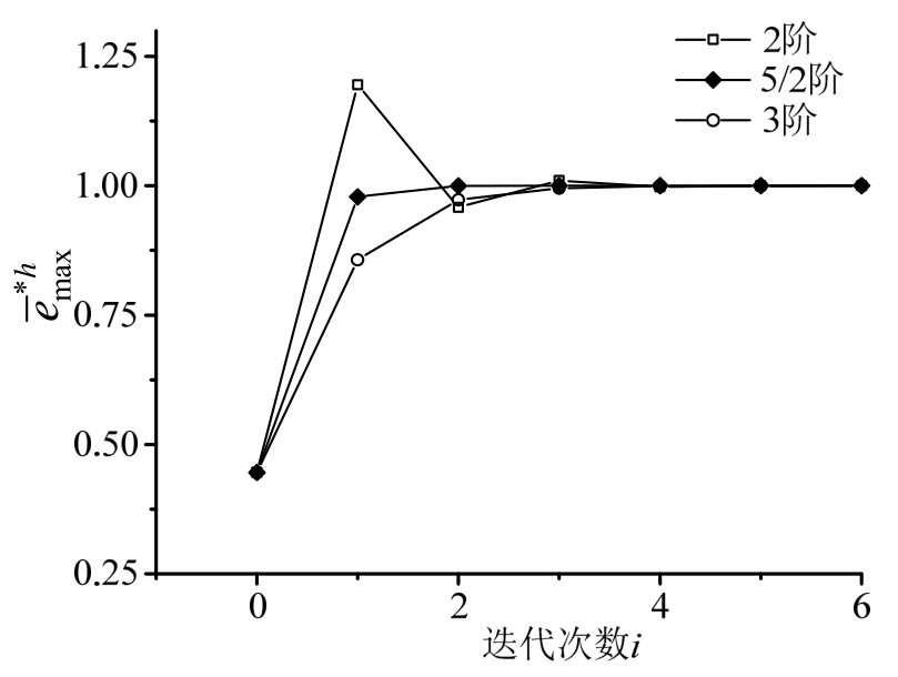 ,初始步长分别取0.02和0.01,收敛结果分别如图3和图4所示。可见,无论初始步长偏大或偏小,5/2阶均为最快收敛,与单自由度算例是一致的。通常来说,在收敛效率上,5/2阶优于3阶,3阶优于2阶。