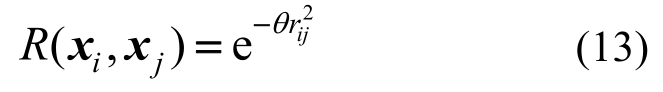 其中:R为对角线为1的对称相关矩阵;R (xi, xj)为节点xi和xj之间的相关函数,这里我们取Gaussian型函数:
