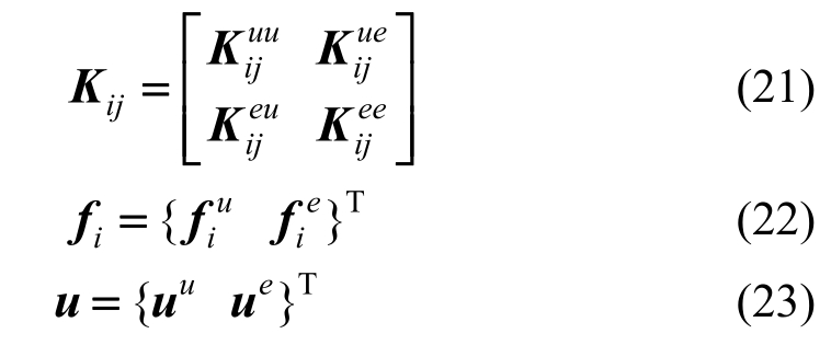 为了简化,上标u代表连续部分,e代表不连续增强部分。跟节点i和 j有关的刚度矩阵K和外荷载向量f可表示为: