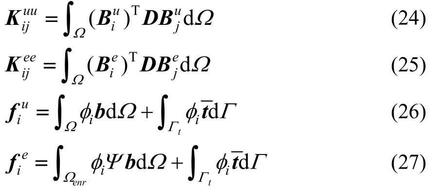 式中,Kuu、Kee和Kue是跟标准EFG插值、增强插值和两者都有关的刚度矩阵,它们分别表示如下:
