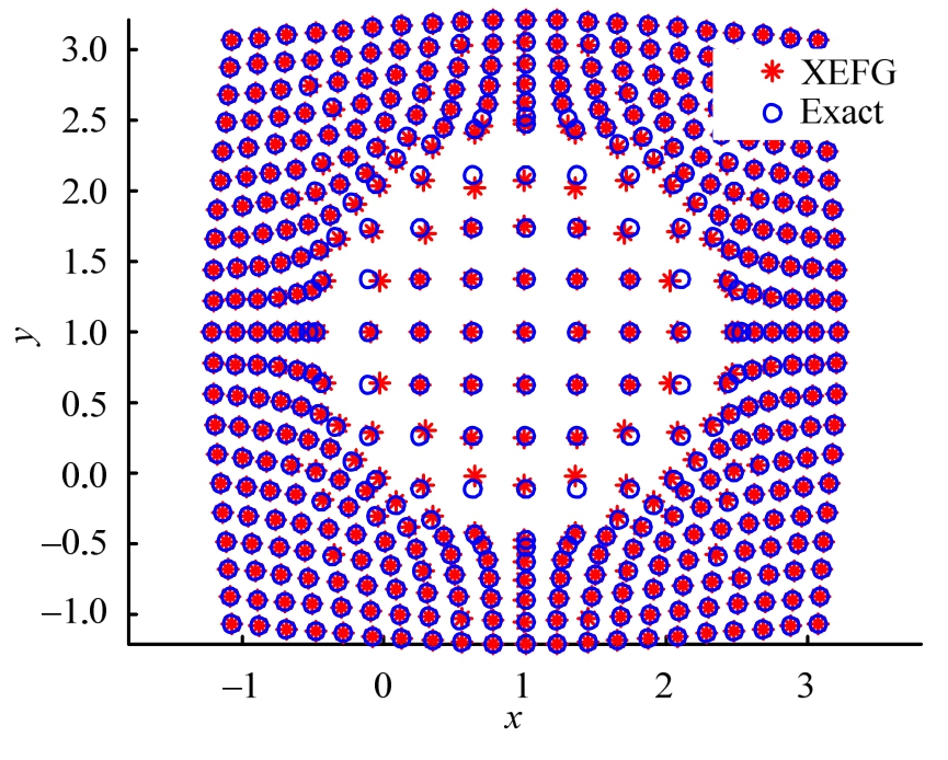 在计算过程中,我们取2×2的方板,方板中心有一半径a=0.4的圆形夹杂1Ω。通过均匀布置的21×21个节点来离散问题域,方板增强节点如图3所示,每个背景网格里面布置6×6个高斯点,节点影响域半径取为1.5,图4给出了XEFG位移计算结果与解析解比较图,很容易可以看出,XEFG计算结果与解析解非常吻合。