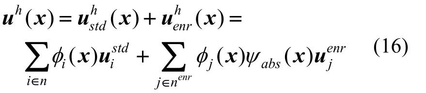 式中:n是节点总数;nenr是支撑与不连续面交叉的节点数;φ是MK形函数;ψabs(x)是增强函数;ustd是标准连续节点位移场函数;uenr是扩展节点的位移场函数。由于扩展的节点一般只限制在特定较小的计算区域内,因此并不会增加太多的附加自由度,具有较高的计算精度。