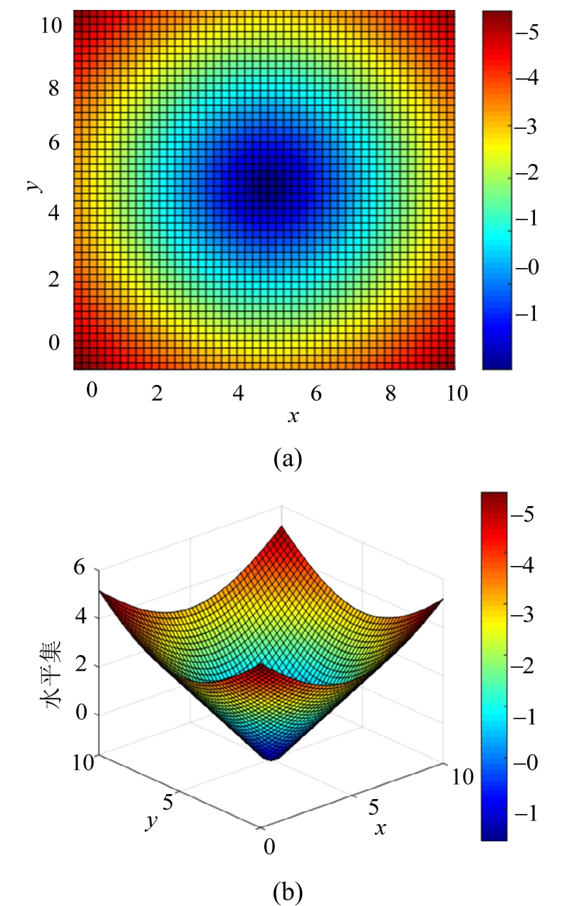 水平集方法[21―22]是1988年Osher和Sethian为了解决火苗外形变化过程而提出的一种用于界面追踪和形状建模的数值技术。其基本思想是将界面看成高一维空间中水平集函数φ(x,t)的零水平集,将界面的速度也扩充到高一维的水平集函数上,然后写出水平集函数所满足的发展方程,求解此方程,推进水平集函数,计算到要求时刻,找出此新时刻水平集函数的零水平集从而得到界面的形状。该方法的优点是水平集函数建立在离散节点上,而不是固定网格,能很自然地处理界面拓扑变化;水平集演化方程与界面维数无关,易于求解高维问题。