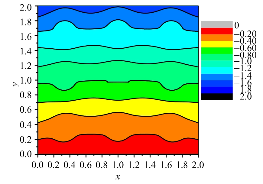 通过含四个圆形夹杂方板和含九个圆形夹杂方板x=1处竖向位移分布,可以看出位移随着夹杂数目的增多,竖向位移出现小幅度的波动,这是由于圆形夹杂的作用。图11给出了含九个圆形夹杂方板竖向位移分布,由于方板下端固定,方板下端竖向位移最小,同时受材料夹杂界面的影响,竖向位移等值线图呈现波浪状分布。
