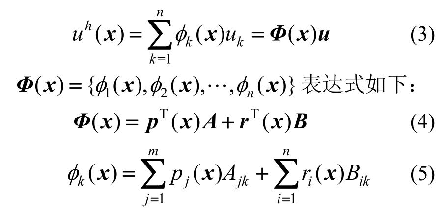 Kriging插值是以南非矿业工程师Kriging D. G.名字命名的一种最优内插法,它以变异函数理论和结构分析为基础,在有限区域内对区域化变量进行无偏最优估计。Gu[15]最早将 Kriging插值引入到EFG法中,从而扩展了无网格法形函数,跟 MLS类似,这里我们称作滑动 Kriging插值法(moving Kriging,MK)。由于MK插值所构造的形函数具备Kronecker delta特性,因此用其构造近似函数具有很大的优势。考虑定义在问题域Ω及其边界Γ上的场函数u(x),设问题域通过N个场节点离散,在任意点x的支持域内有n个场节点,若已知节点的场函数值为 u ( x1) ,u ( x2),… ,u (xn),则点x处的近似场函数可以通过MK插值来逼近: