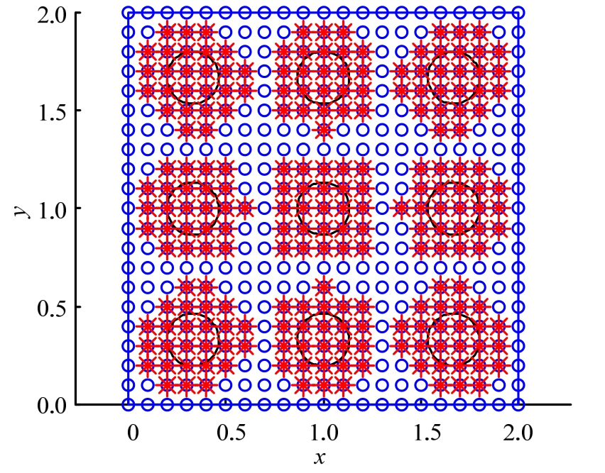 取无量纲边长为L=2的方形板,考虑如图7所示的含四个圆形夹杂(半径r=0.2)和图8所示的含九个圆形夹杂(半径 r = 0 .133)两种情况,方板下端固定,上端施加均布荷载p=1。方形板弹性模量E1=1,泊松比ν1=0.3;夹杂弹性模量E2=10,泊松比ν2=0.3,按平面应力问题进行计算。节点影响域半径取为 1.5,每个背景网格里面布置6×6个高斯点。