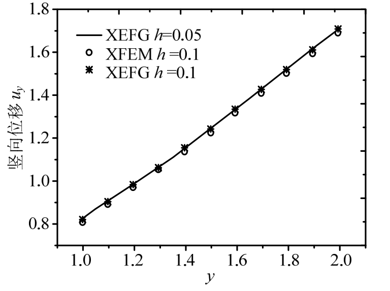 而在含九个圆形夹杂方形板计算过程中,每个背景网格里面布置6×6个高斯点,节点影响域半径分别取1.4(h=0.1)和1.2(h = 0 .05),图10给出了XEFG和XFEM计算得到x=1处竖向位移分布,很明显节点间距(h=0.1)一致的情况下,XEFG相比XFEM精度更高。