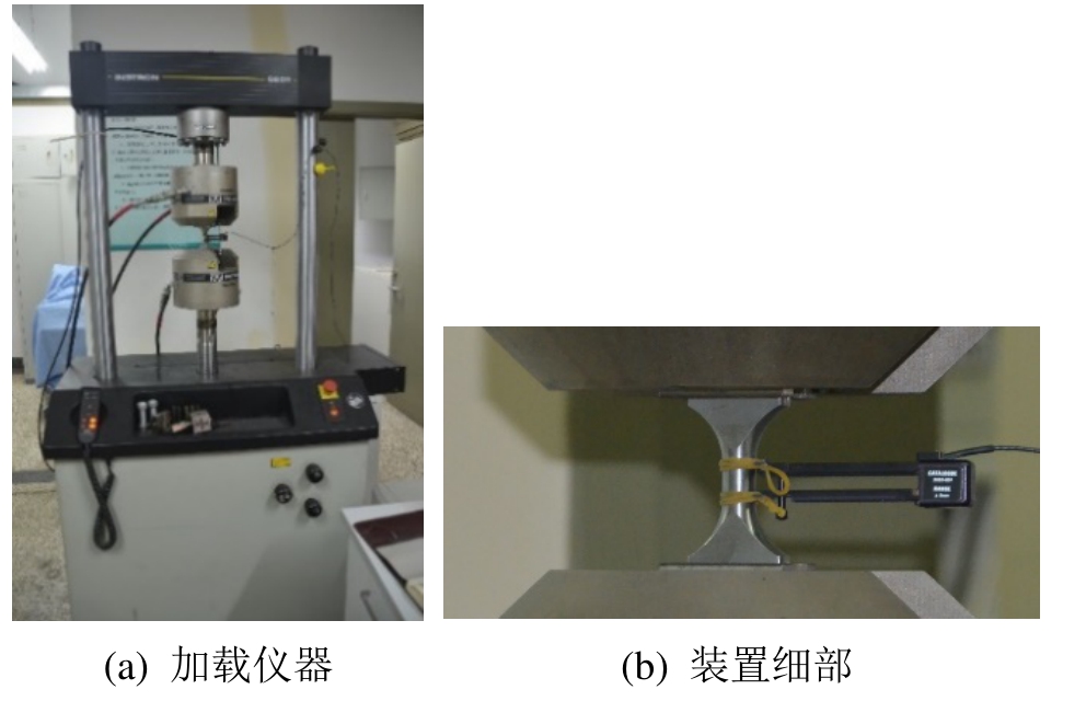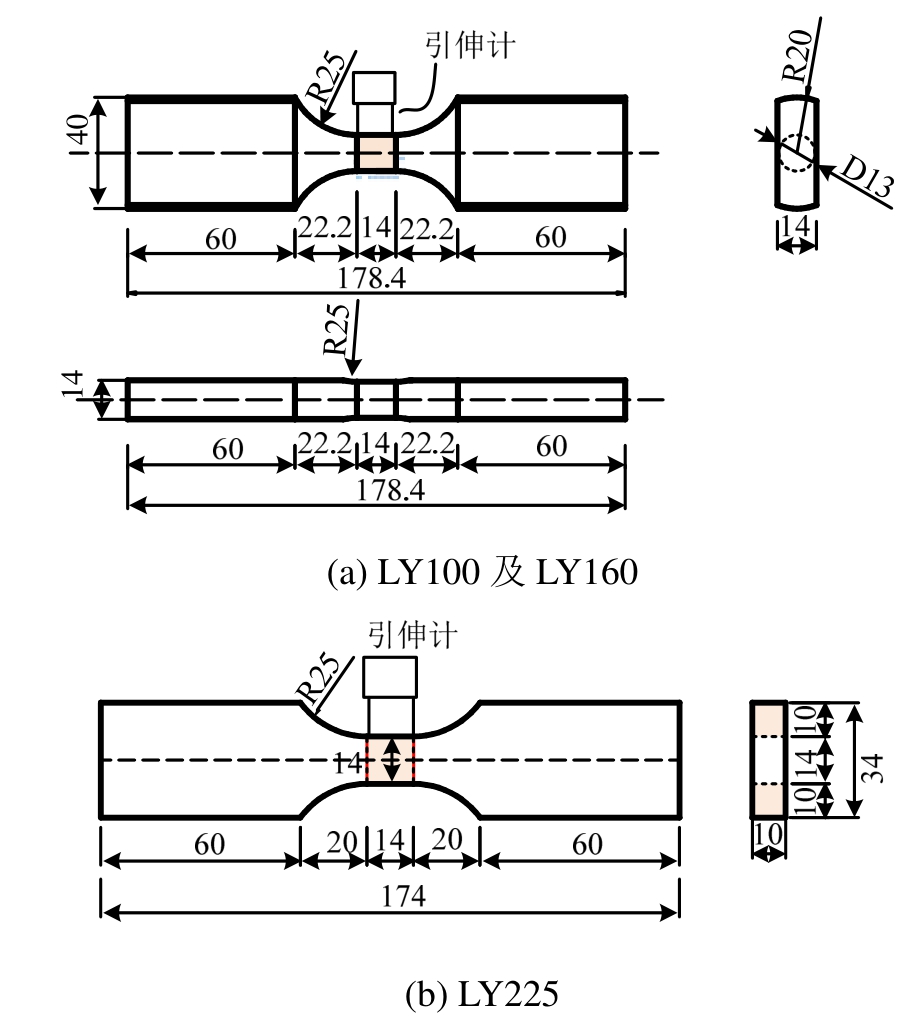 试验所用材料为鞍钢生产的低屈服点钢,包括LY100、LY160、LY225三种牌号。同一牌号的试件均取自从同一块钢板,且试件长度沿钢板轧制方向。LY100和LY160试件参考文献[5]设计,平行段采用直径为13mm的圆形截面,LY225试件平行段采用矩形截面,截面长为14 mm,宽为10 mm,两种试件平行段长度均为 14 mm,夹持段长度均为60mm,过渡段圆弧半径为25mm,具体试件尺寸如图1所示。试验过程中采用了两种不同形式的试件,其原因主要是因为在率先进行的LY225循环加载试验中,部分板状试件在压应变较大时发生了屈曲,导致试验数据无效。为避免上述现象发生,在LY100和LY160试件的设计和加工过程中对原有方案进行了调整,后续试验情况表明,设计成棒状试件能有效的避免试件屈曲,但仍有部分试件由于不可避免的初弯曲、初偏心等原因而发生屈曲。
