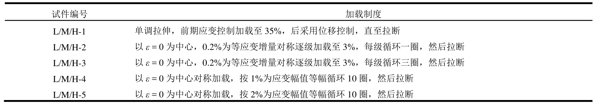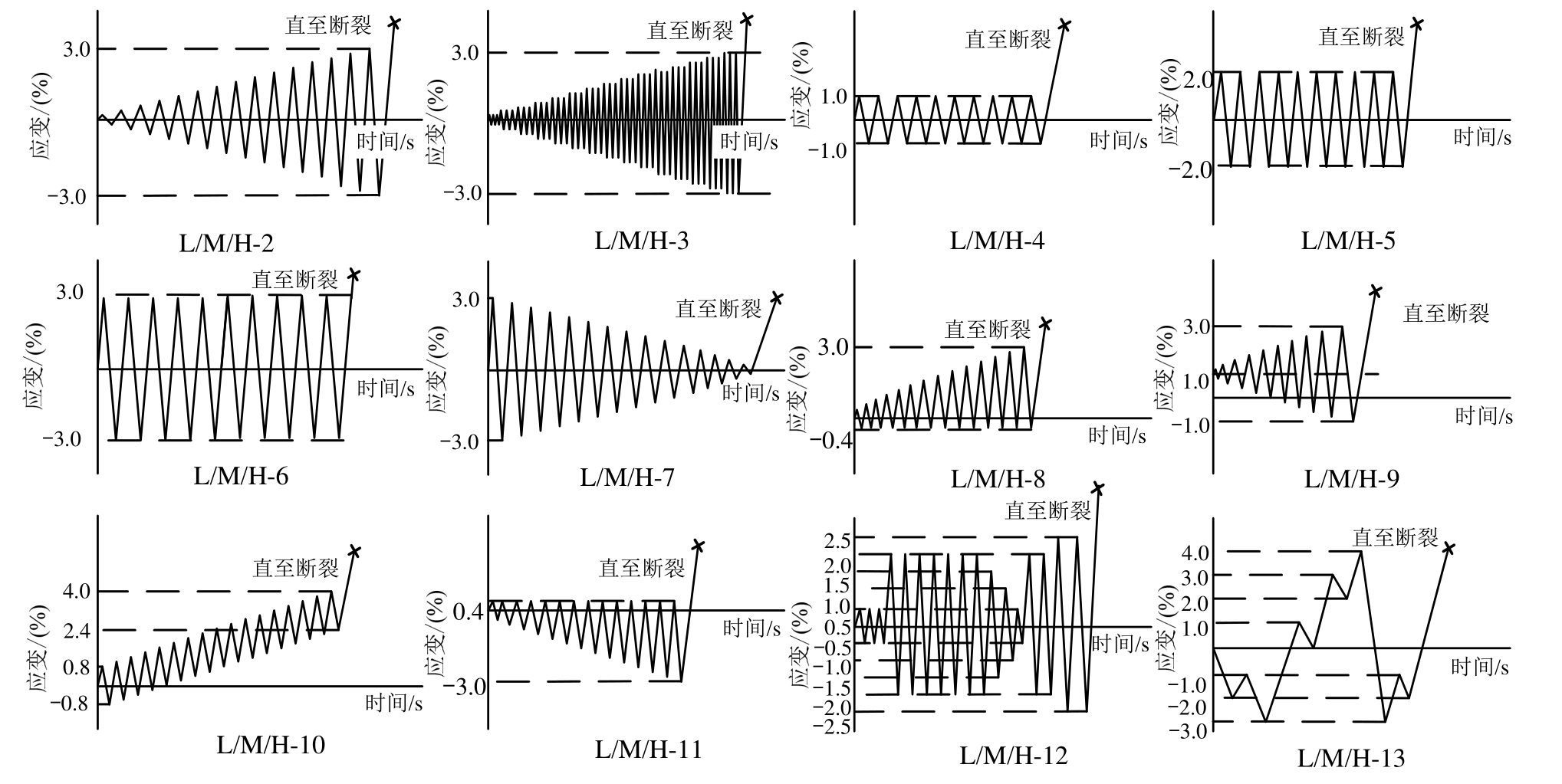 试验加载装置为Instron Model 8801拉压扭万能疲劳试验机,试验通过引伸计测得的应变控制加载,引伸计标距为12.5 mm,量程为40%,试验装置如图2所示。试验包括单调拉伸试验及12种不同加载制度的循环加载试验,具体循环加载制度如表1和图3所示,其中L代表LY100,M代表LY160,H代表LY225。每种钢材取3根~4根试件进行单调拉伸试验,每种循环加载制度下均取1根试件进行试验。以上加载制度中包含了等幅与变幅循环、中心与偏心循环、移幅循环、随机加载,同时考虑了不同循环加载制度之间的结合以及循环次数的影响,具有一定的代表性。
