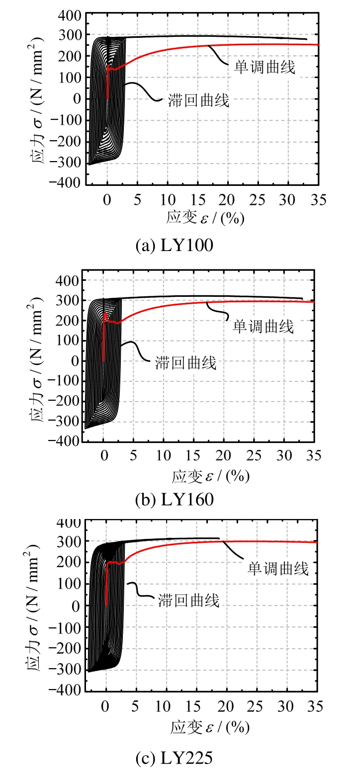 由于考虑到引伸计的量程限制(40%),在单调加载中应变控制加载至35%后采用位移加载,此后应变数值未给出。三种钢材单调加载试验结果如图5及表2所示,其中 E为弹性模量(根据弹性段1/3fy~2/3fy范围内直线段斜率确定),fy为下屈服强度,fu为抗拉强度,A为断后伸长率,εu为抗拉强度所对应极限应变。从图5及表2可以看出:1)3种低屈服点钢均有明显屈服平台,但平台段较短;2)低屈服点钢延性较好,试件极限应变均超过20%,当应变达到35%时,3种钢材均未出现明显下降段;3)3种钢材屈服后强化段明显,屈强比较小,具有良好的承载潜能;4)LY160和LY225两种牌号的钢材极限荷载、断后伸长率、屈强比等指标较为接近。