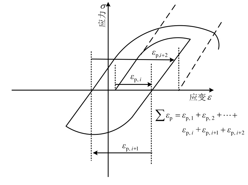 正如前文所述,低屈服点钢常用于结构的耗能减震构件,而对于此类构件(如防屈曲耗能支撑等),其在循环荷载下的累积塑性变形往往是评价构件性能的重要指标[11],反映到材料层面,则表现为材料的累积塑性应变。参考已有文献[12]中对节点累积塑性转角定义方法,在此定义累积塑性应变