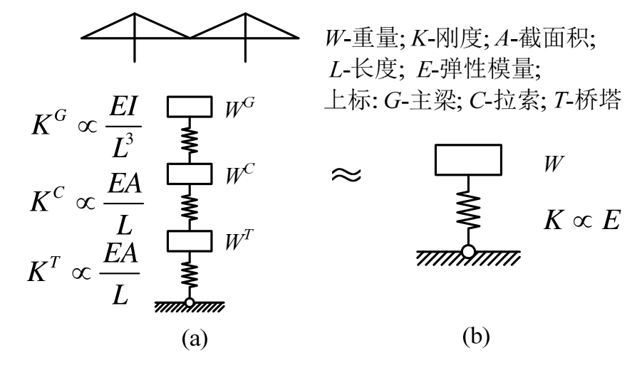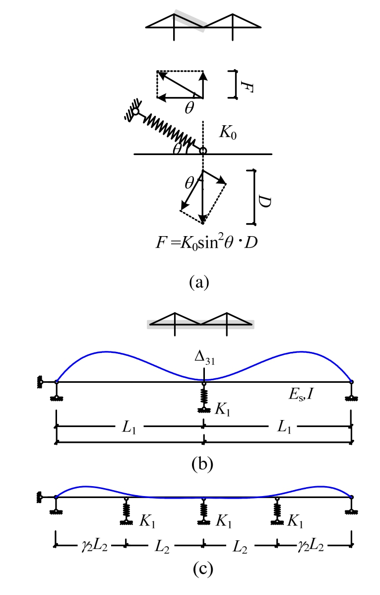 其中:I是主梁抗弯惯性矩;K1是拉索等效弹簧刚度,可按图10(a)推得。对于背景桥梁,L1= 715 m,h =4 m,I=4.45 m4,中跨最长拉索 K1=1.98×106N/m,则