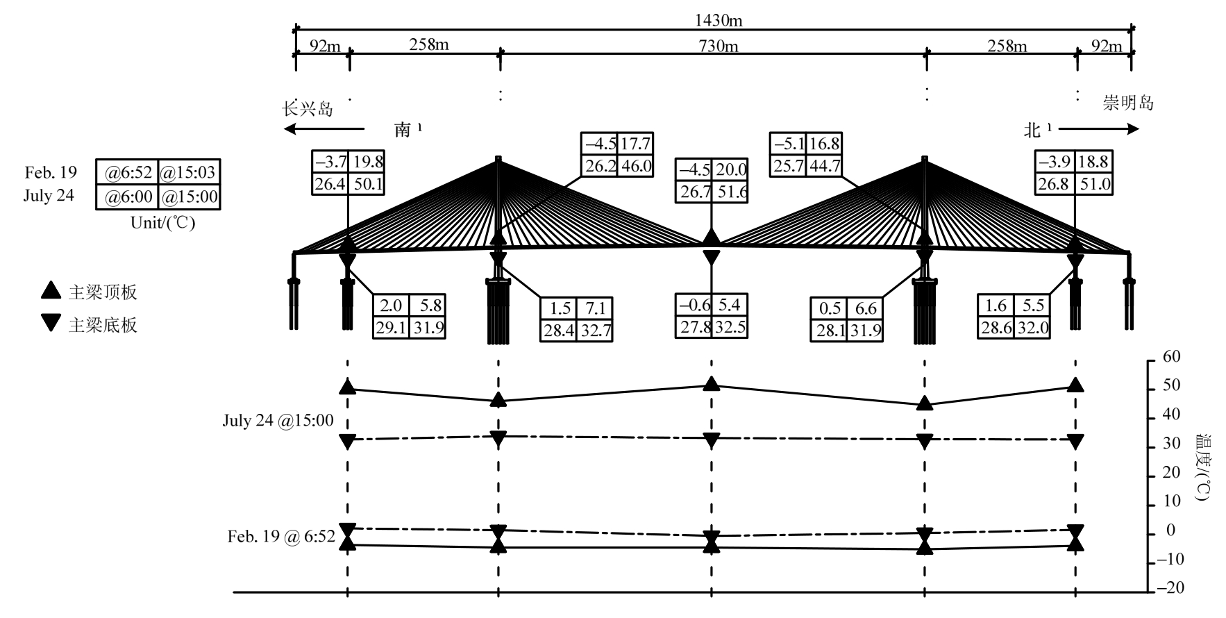 不难发现,斜拉桥跨中竖向位移与温度的相关性比悬索桥复杂,且实测现象背后的机理并未得到清晰的阐述。作者分析了上海长江大桥(斜拉桥)的结构健康监测数据,发现只从环境温度或主梁平均温度的角度难以同时解释跨中竖向位移在一天和一年尺度上的变化现象,非常有必要从机理层面探讨 DT变化的原因。下文首先简述上海长江大桥温度场和 DT的监测结果,接着通过平面几何分析直观展示温度对 DT的影响机理,然后根据有限元计算比较各种机理的相对影响程度,最后是结果讨论和结论。本文不仅能加深对斜拉桥这种常见桥型温度效应的认识,还能为海量监测数据的合理解读和信息挖掘提供示范,有助于提高桥梁管理养护技术水平。
