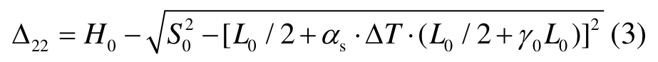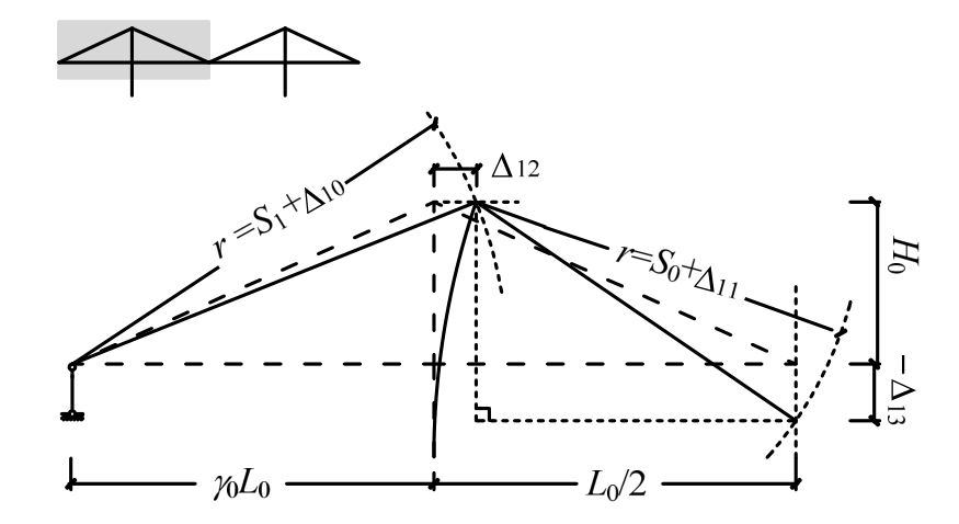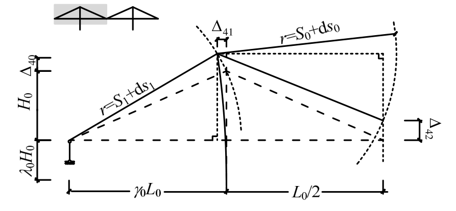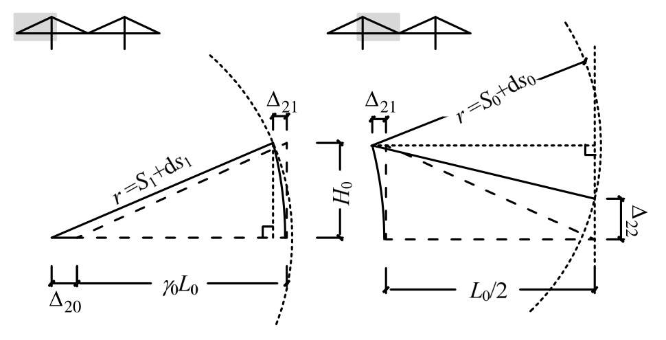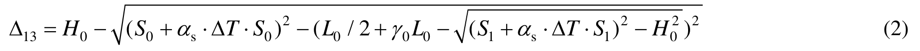 升温时,中跨拉索膨胀伸长将引起桥面下降(图6(a));因梁端有竖向支承,边跨拉索的伸长将使桥塔向内倾斜,引起跨中桥面进一步下降。根据图8中的几何关系(Δ13以向上运动为正):