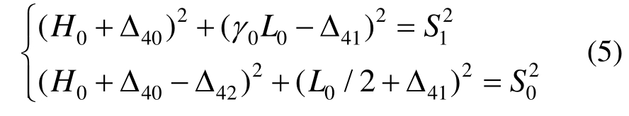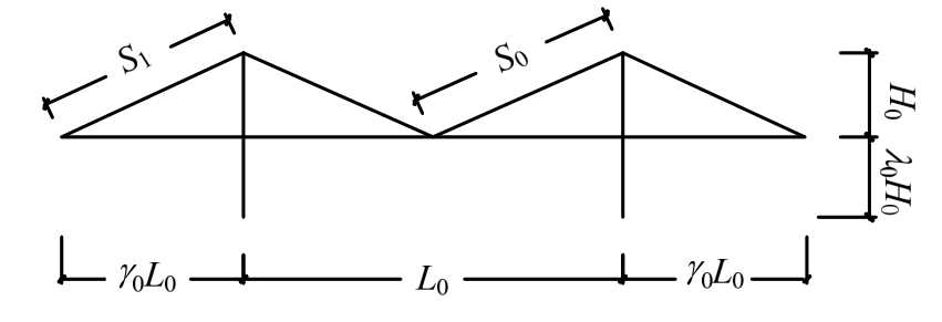 为配合对机理的理解,本节针对上海长江大桥的简化模型(图7),通过平面几何分析估计了升温1℃时的DT。该模型的主跨、边跨长度为L0=730 m,γ0L0=350 m;桥塔在桥面以上、以下的高度为H0=150 m,λ0H0=60 m;中跨、边跨拉索长S0=394.62 m,S1=380.79 m;钢和混凝土的线膨胀系数分别取αs=1.2×10-5℃-1,αc=1.0×10-5℃-1。