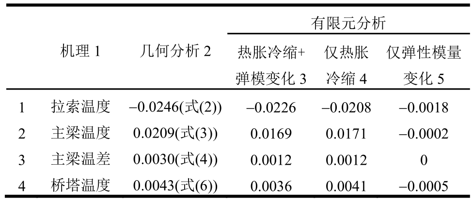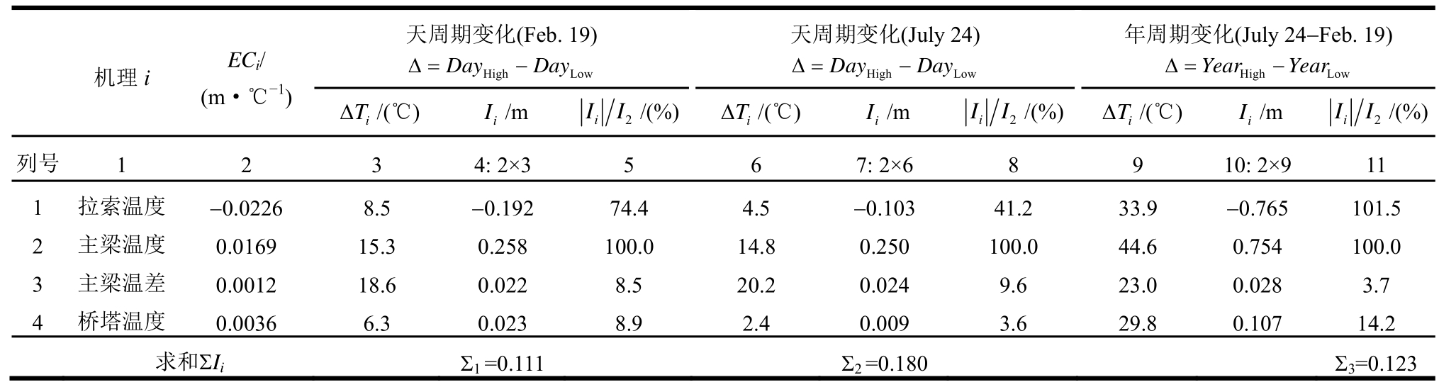 则反映了效应大小。表2中第5行的跨中竖向位移总和Σ1~Σ3为4种温度机理分项效应的代数和,它们与同时考虑各构件温度变化计算得到的总温度变形十分接近,误差约 3%,这说明温度对跨中竖向位移的效应可通过线性叠加模型近似。