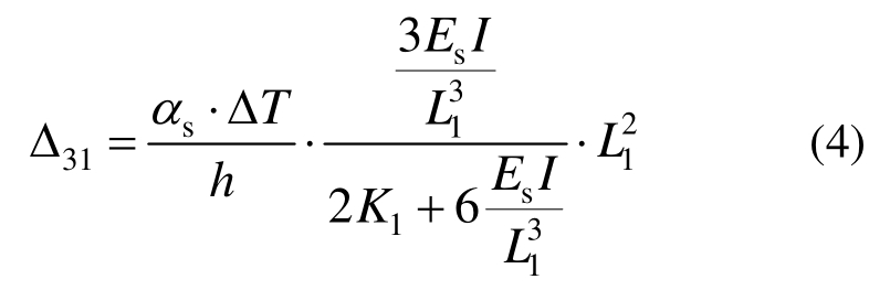 由于阳光照射的原因,钢箱梁顶、底板的温差非常明显,最大可达20℃左右。当顶板伸长量大于底板时,截面会产生曲率。假定温度沿截面高度h线性变化,且曲率沿梁长方向保持不变,则当仅考虑中跨最长拉索的弹性支承作用时(图10(b)),由结构力学可推得跨中竖向位移Δ31为: