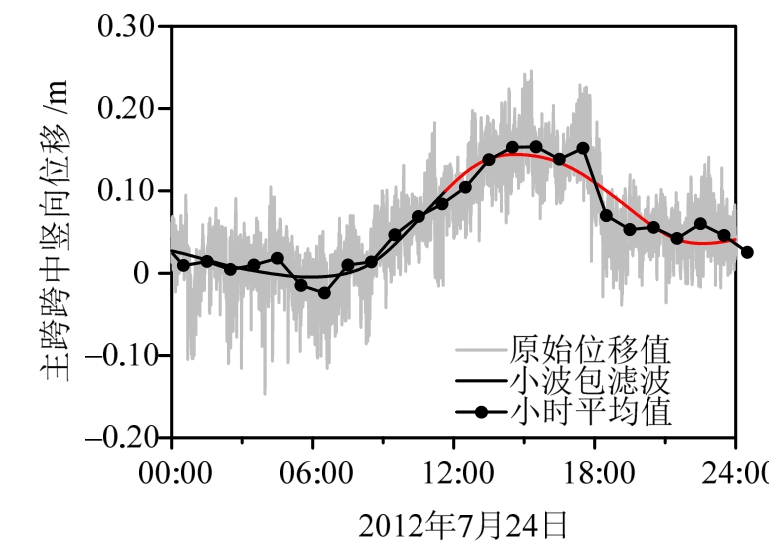 跨中竖向位移是多种运营环境作用的综合效应。由于结构温度的变化频率约在6.0×10-5Hz以下,远低于交通荷载和风荷载等的变化频率,因此可通过小波包滤波从实测总位移中分离出由温度变化引起的长周期成分 DT(图3)。考虑到温度效应的分离并无严格的理论证明,图中还绘制了由小时平均值所估计的DT,可见由小波包滤波获得的缓变成分更为平滑自然,更适合代表温度变形。