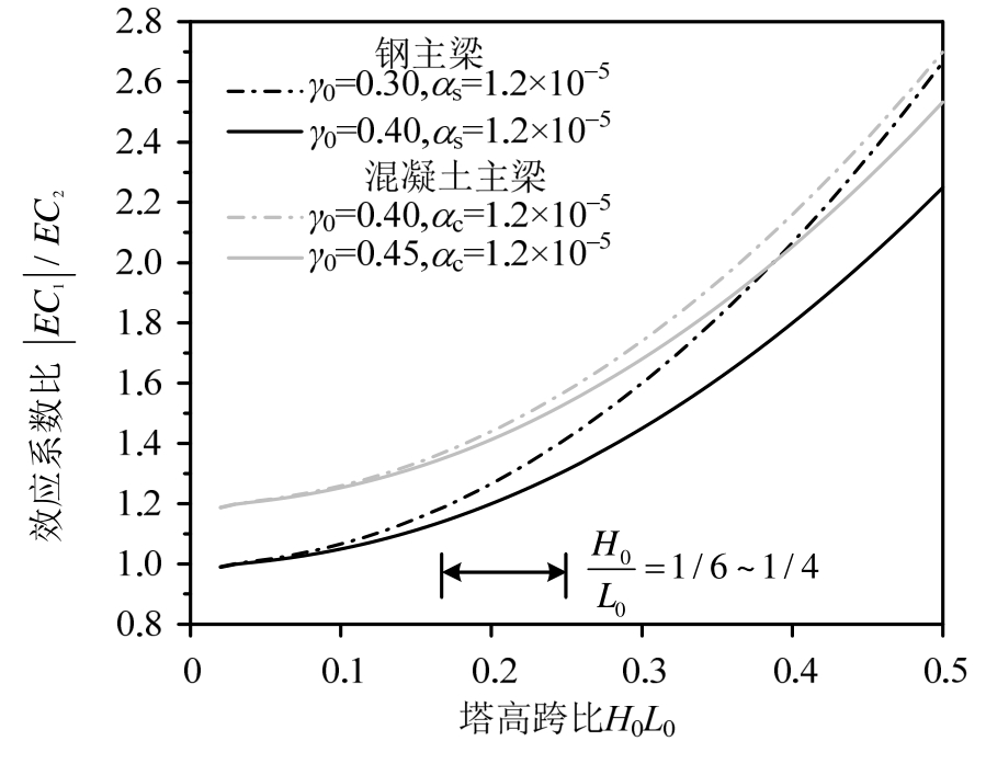(桥面以上塔高与主跨跨径之比)、边中跨比0γ和材料线膨胀系数α。根据规范[21],钢主梁斜拉桥的边中跨比常取0.30~0.40,混凝土主梁的0γ通常为0.40~0.45。由图17可见,