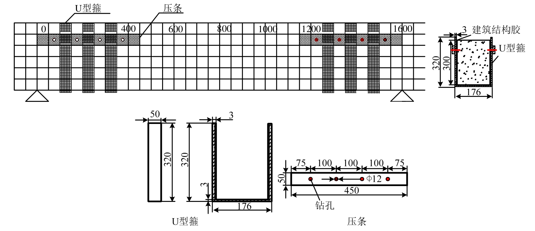 试验一共设计了7片梁,其中包括3片锈蚀梁(保护层厚度分别为 25 mm、30 mm、35 mm)和 4片锈蚀后进行U型箍与钢板压条加固梁(其中3片梁加固以后进行二次锈蚀,另外的 1片保护层为30 mm的加固锈蚀梁则不再锈蚀),各片梁的加固参数如表2所示。由于自然腐蚀耗时长,故该文采用电化学加速腐蚀的方法进行试验梁的腐蚀。图2为腐蚀示意图,试验梁放置在5%的NaCl溶液中,阳极与露出的钢筋相连,阴极与不锈钢板连接,通过法拉第定律确定腐蚀时间。达到 10%设计锈蚀率后,取出锈蚀梁,其中(C10C25、C10C30、C10C35)不再进行加固和二次锈蚀,U10C30锈蚀加固不再进行二次锈蚀,U10C25-C、U10C30-C、U10C35-C采用厚度为3 mm的U型箍板锚贴加固后进行二次锈蚀(试验梁的加固示意图如图3所示)。为防止U型箍在结构胶还未完全凝固之前由于粘贴、结合不牢而出现空鼓现象,在U型箍安装完毕后,在锈蚀梁的A、B两面分别安装钢板压条,以达到U型箍与混凝土结合紧密的效果;然后将加固锈蚀梁再次放入腐蚀箱中,进行二次锈蚀,以达到15%的最终设计锈蚀率。
