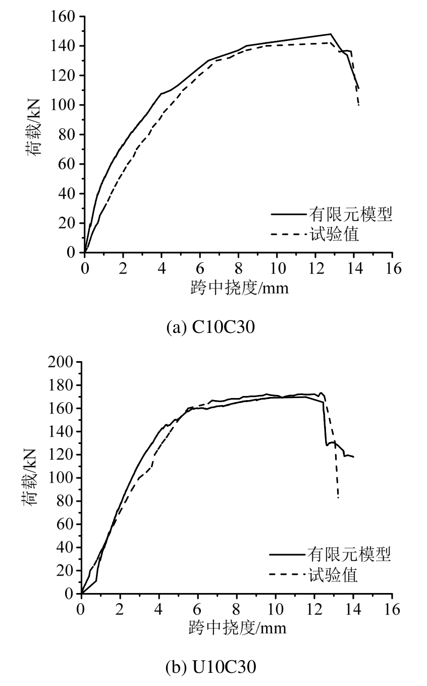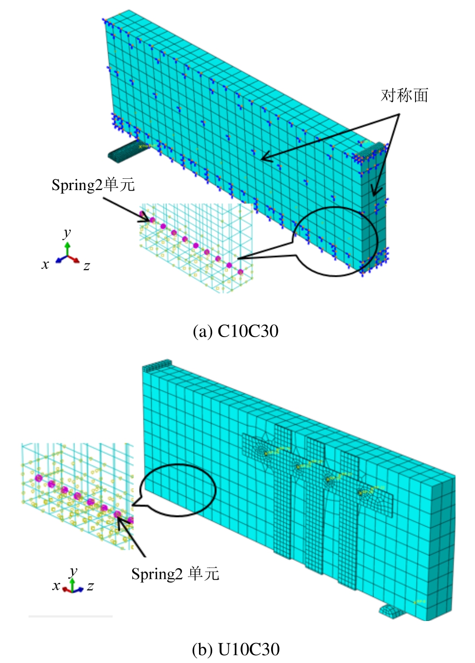 为了与试验结果进行对比并进行参数分析,采用有限元软件ABAQUS对三种类型的梁(C10C30、U10C30、U10C30-C)进行了数值模拟,探究了U型箍加固的厚度与位置对试验梁加固性能的影响。 模型所用的加固模型处理手段和结果,可为考虑复杂荷载和边界条件下的实际桥梁加固分析奠定基础。