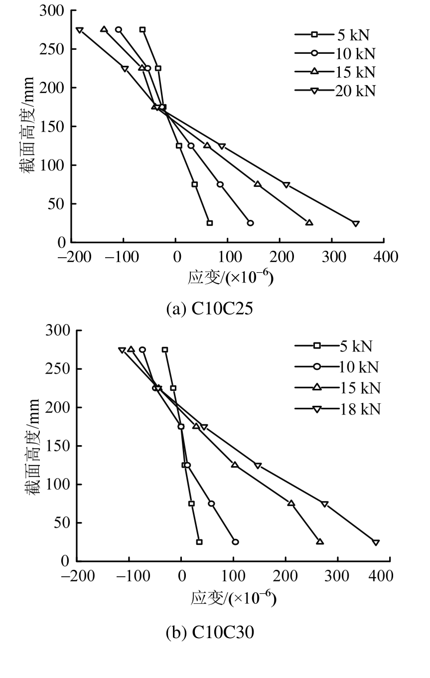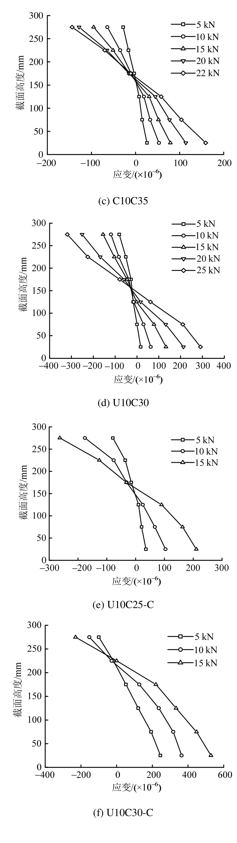 为了解梁截面方向的应变变化规律,图6绘制了各片梁跨中截面的应变随梁高的变化曲线。由分析得知,各试验梁均能较好地符合平截面假定。