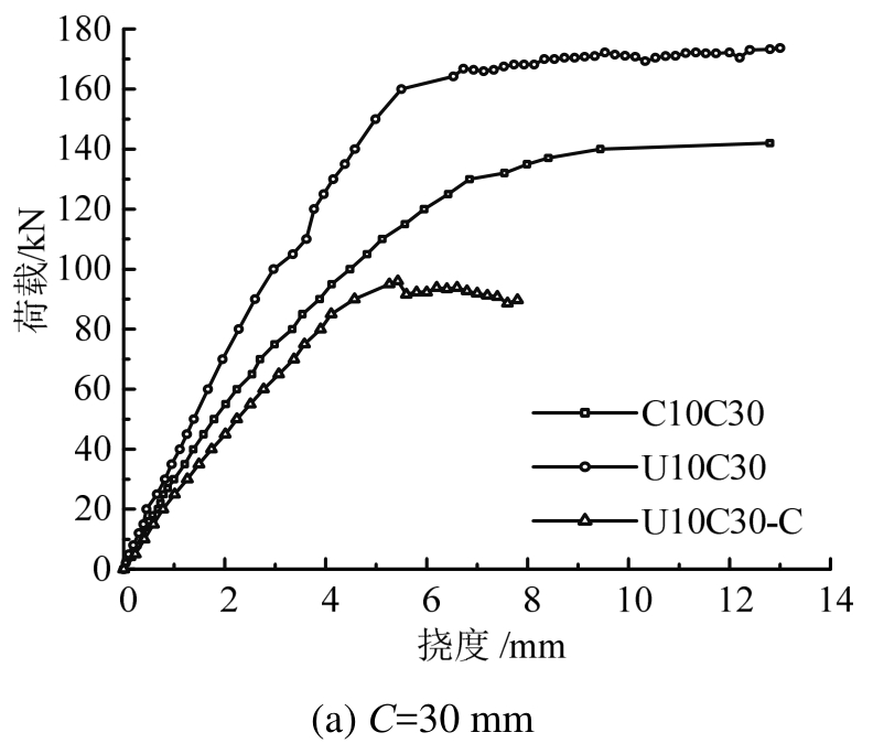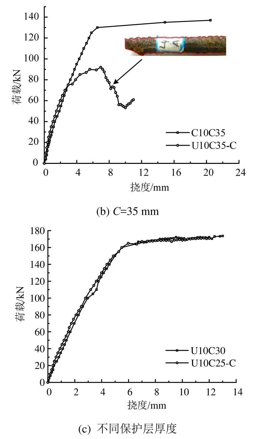 锈蚀率相近的U10C30与U10C25-C,在U型箍的束缚下,斜裂缝出现晚,裂缝主要分布在跨中区域但也出现了倾斜的裂缝,裂缝已不是从支座处发展而是从跨中的U型箍附近开展,破坏时竖向裂缝贯通梁底,斜裂缝宽度加大,但不会发展为破坏裂缝,呈弯剪破坏特征(如图9(b))。这种破坏模式和U型纤维增强复合材料FRP加固锈蚀梁的破坏模式不同,后者的破坏形态主要表现为 FRP拉裂或者剥落[17]。锈蚀率较大的U10C30-C、U10C35-C,较低荷载下便出现了竖直裂缝并快速延伸,受压区尚未压坏,弯曲裂缝比一次锈蚀梁的宽度大(如图9(c)所示),不宜继续承载,破坏形态类似少筋梁,结合上述的锈蚀钢筋图可知,这是由于在锈蚀不均匀性以及二次锈蚀共同作用下,跨中区域钢筋受到更为严重的氯盐侵蚀,从而导致其抗弯性能降低,最终表现为竖直裂缝快速发展。