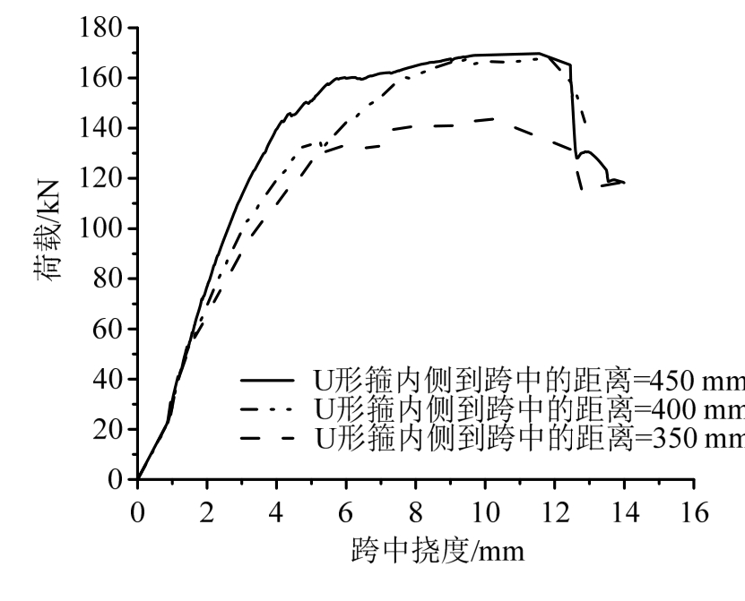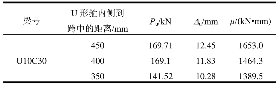 改变 U型箍到跨中的距离,变化范围为350 mm~450 mm,并获取各情形下构件的变形曲线、极限荷载、挠度等结果(如图15及表6所示)。U型箍距离跨中越近,极限荷载、极限荷载对应的挠度值、吸收能量均显著降低。因此,U型箍应布置在远离跨中、靠近支座附近的位置,这样才能更充分地发挥U型箍的抗剪作用,以有效地提升构件的强度与刚度。