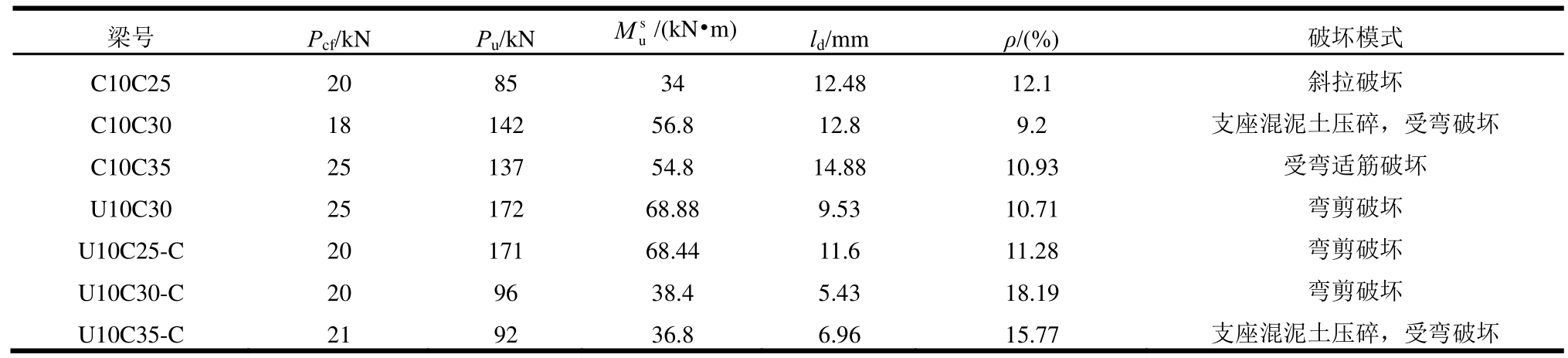 注:Pu和Δu分别是极限荷载和对应的极限挠度;μ为能量吸收值(荷载开始急速下降前荷载-挠度曲线面积)。