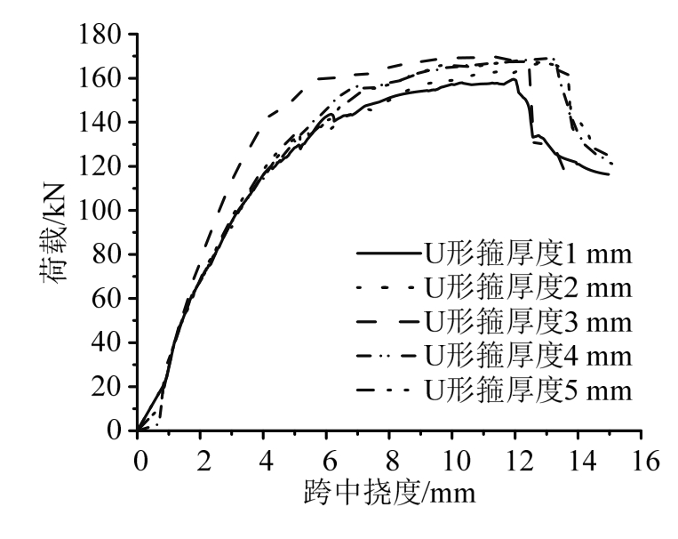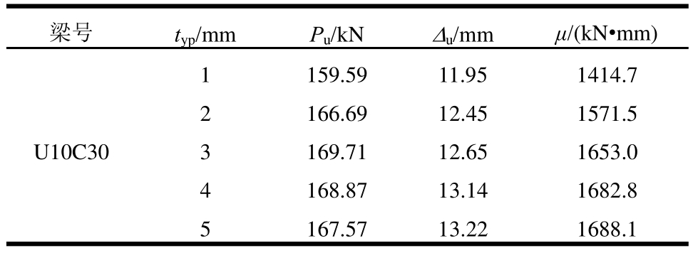 以 U10C30为例,改变 U型箍的厚度(1 mm~5 mm),对其进行数值模拟,绘制各种情形下的挠度曲线如图14所示,并列出相关参数的计算结果见表5。