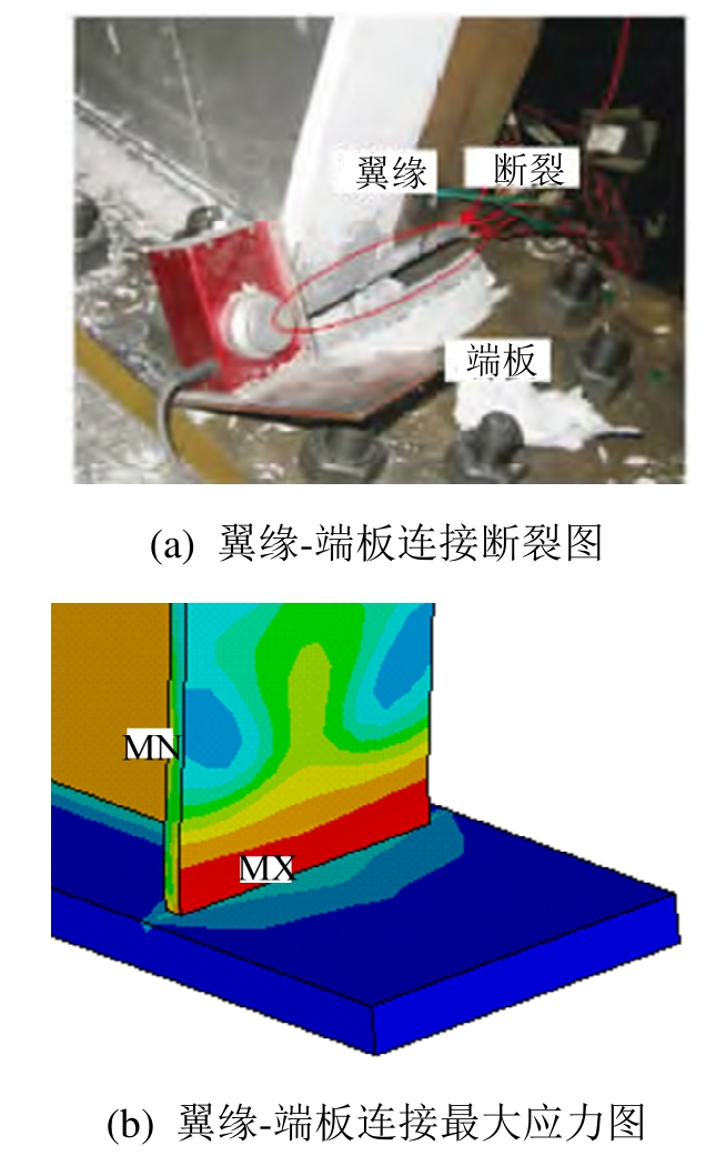 由于有限元分析时未考虑焊缝及板件断裂的影响,仅从应力最大处反应可能发生的破坏[14]。试验分析结果表明,试件Q11和Q21的破坏模式为翼缘与端板连接处的焊缝被破坏,如图6(a)所示;试件Q13的破坏模式为腹板与加劲肋交接处的腹板断裂。有限元分析结果表明,试件Q11和Q21的翼缘与端板连接处的应力最大,如图6(b)所示;Q13在腹板与加劲肋交接处应力集中严重,即认为有限元分析所得的破坏模式与试验分析结果基本吻合。