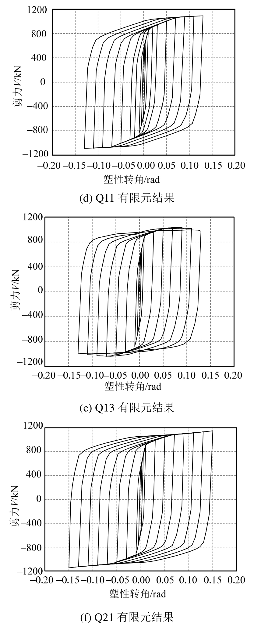 图5中各试件试验及有限元分析所得的剪力-转角曲线均相近。试件Q11的试验及有限元分析所得最大塑性转角均为0.13,剪力分别为1107 kN和1092 kN,超强系数分别为1.87和1.85;试件Q13的试验及有限元分析所得最大塑性转角均为0.11,剪力分别为 970 kN和 1002 kN,超强系数分别为1.64和1.69,有限元结果略大于试验结果,可能是由于试验加载后期出现屈曲转换现象,而在有限元分析中仅出现屈曲现象。另外,试件Q13加载后期出现承载力下降的现象,主要是由于加劲肋间距超出规范允许值,腹板已发生较大非弹性屈曲,降低构件后期的承载能力;试件Q21的试验及有限元分析所得最大塑性转角为均0.15,剪力分别为1180 kN和1149 kN,超强系数分别为1.99和1.95。由于该截面的加劲肋最大允许间距为220 mm[8],当加劲肋间距放宽至330 mm时,其腹板发生较大屈曲,对构件的超强系数影响明显,但仍满足要求。