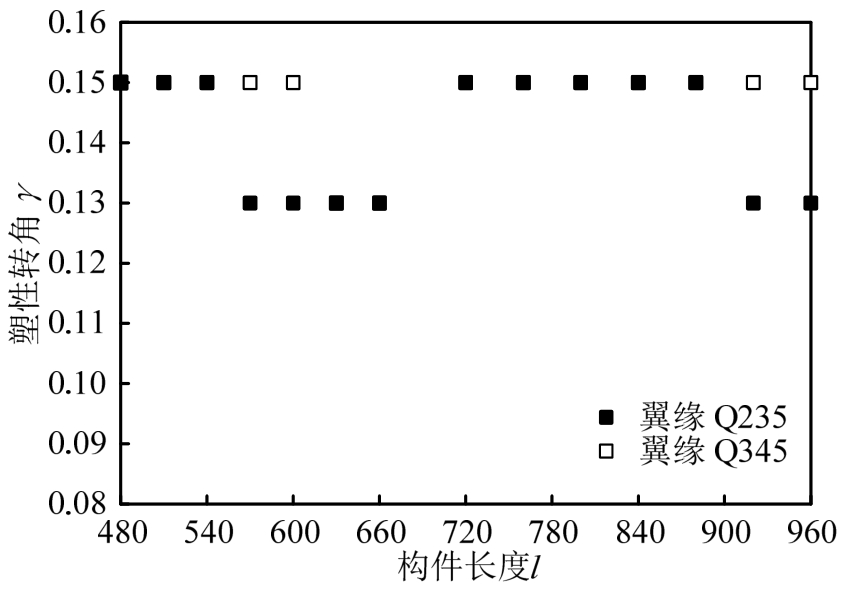 图14为翼缘宽厚比与塑性转角的关系图,左、右两条虚线分别是翼缘宽厚比等于8ε和10ε。从图中可知,构件的最小塑性转角为0.13,放宽翼缘宽厚比值至 10ε,可提高翼缘对腹板的约束作用,由此提高部分构件的变形能力,增大其塑性转角。