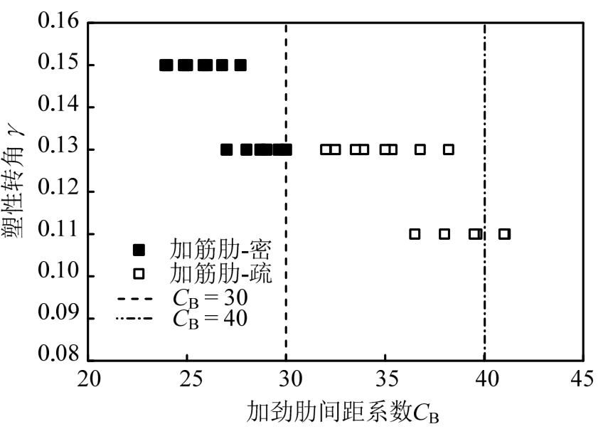 图10为加劲肋间距系数与塑性转角的关系图。当加劲肋间距系数小于规范允许值 30时,最小超强系数为 0.13;当加劲肋间距系数放宽至 40时,最小的塑性转角值为0.11,均大于规范要求值0.08。因此,对于短剪切型消能梁段,将其加劲肋系数放宽至40,其超强系数仍能满足规范要求。