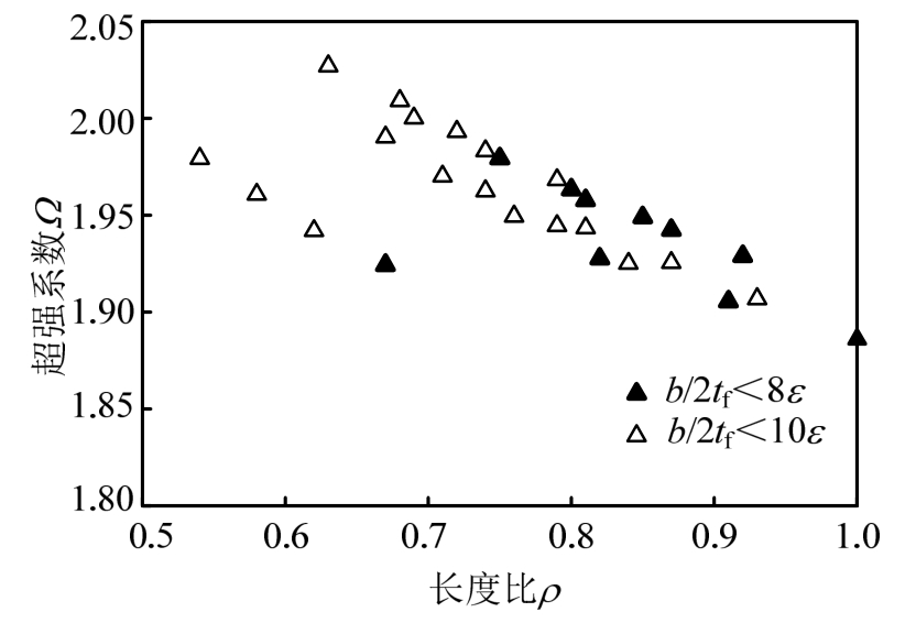 往复荷载下,短剪切型消能梁段的翼缘宽厚比、长度比和超强系数关系如图11所示。图中填充和未填充的三角形分别为翼缘宽厚比满足规范要求和超出规范值时的超强系数值。截面仅增大翼缘宽度时会增大其塑性模量,从而导致其长度比的减小。短剪切型消能梁段的超强系数随其长度比的增大而略微减小,超强系数的平均值为1.95,翼缘宽厚比对构件超强系数的影响不明显。