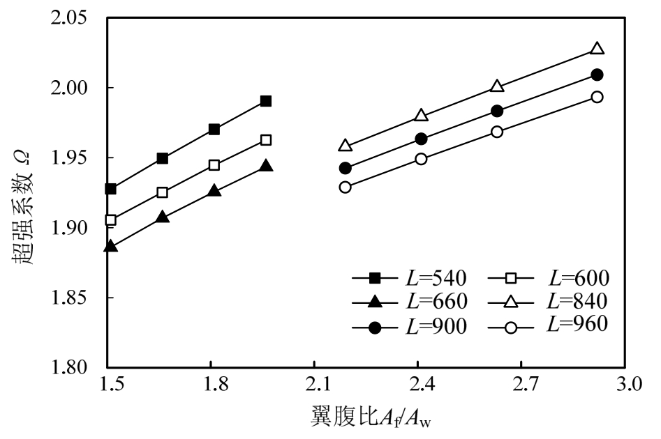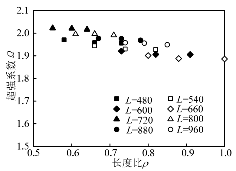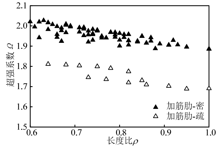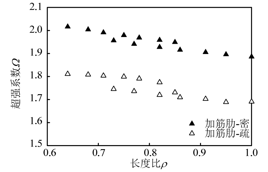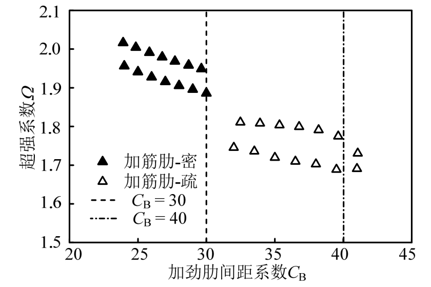 图8为加劲肋间距系数与超强系数的关系图。当加劲肋间距系数小于规范值 30时,最小超强系数为1.90,平均值为1.95;当加劲肋间距系数放宽至40时,最小的超强系数值1.70,平均值为1.75。因此,放宽加劲肋间距系数至 40会对其超强系数有所影响,但仍能满足规范要求。